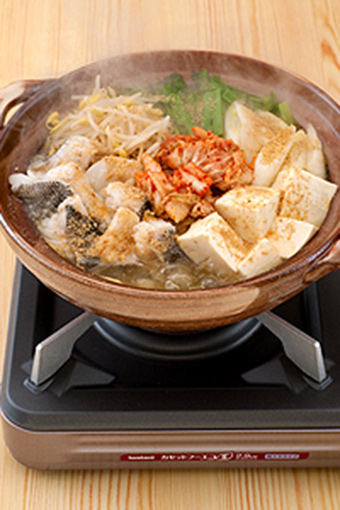 鍋里加水、雞精和鹽,調中火煮開后加入鱈魚肉、豆芽菜、大蔥、豆腐和泡菜,再次煮開后加韭菜并撒上一層白芝麻粉即可。
