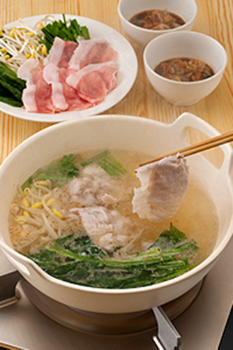 鍋內倒芝麻油,小火熱鍋后將大蒜倒入翻炒。爆香后加水和雞精煮開。加入芝麻粉,將蔬菜一點點放進鍋中煮熟。中途一邊撇開浮沫,一邊涮肉,蘸取加了泡菜制作而成的調味料味道更加!
