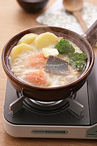 - 高湯入鍋,中火熬煮,土豆瀝干后放入鍋中。煮開后調小火煮5分鐘,加入鮭魚肉和蔬菜。蔬菜變軟后加入鮮牛奶,用調料A調味后加黃油即可。
