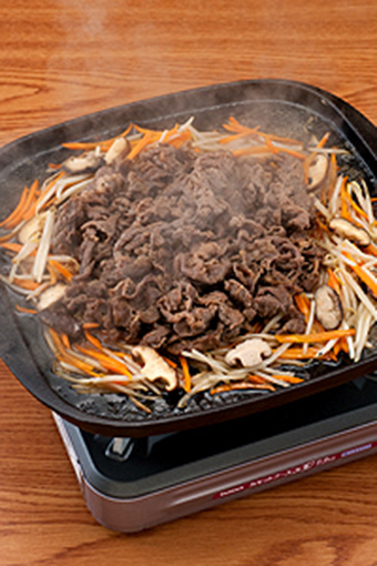 - 把我們喜愛的烤肉盤用大火加熱,倒入芝麻油調和味道。將腌制好的牛肉倒入盤中翻炒,待肉的顏色變深,煮出汁后,再將步驟1的蔬菜倒入一齊翻炒即可。